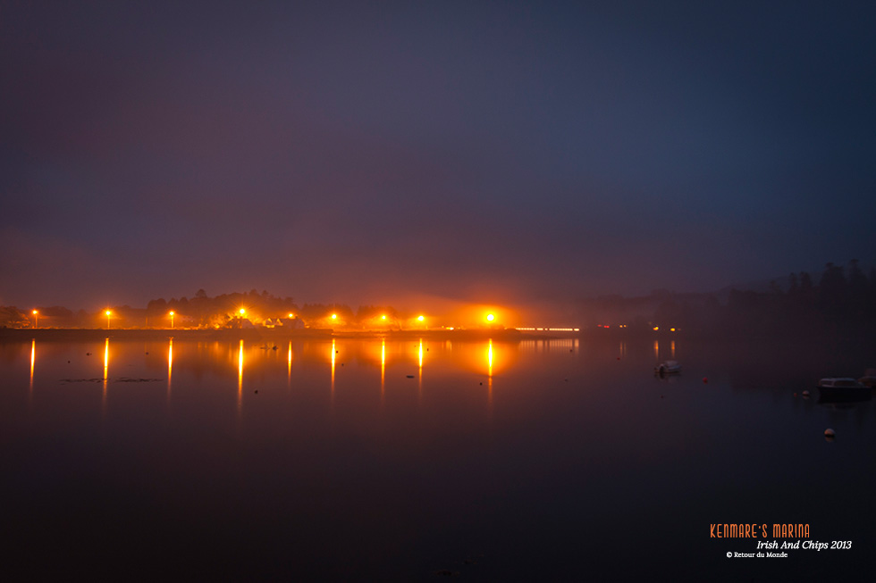 Le jour se lève sur le port de Portmagee, bien que les bateaux soient encore dans une semi pénombre, au loin sur la droite, on distingue rapidement le soleil pointer entre deux montagnes. Dehors il bruine très légèrement, mais impossible de savoir si ça va se maintenir.