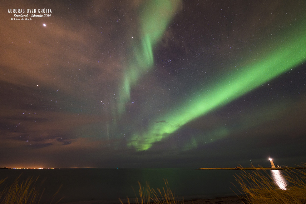 C’est l’extrême ouest de Reykjavik, une petite île reliée à la terre d’Islande par un isthme. Le spot est parfait, et on avance dans le noir sur la plage. Nous ne sommes pas seuls, mais qu’importe l’endroit est parfait.