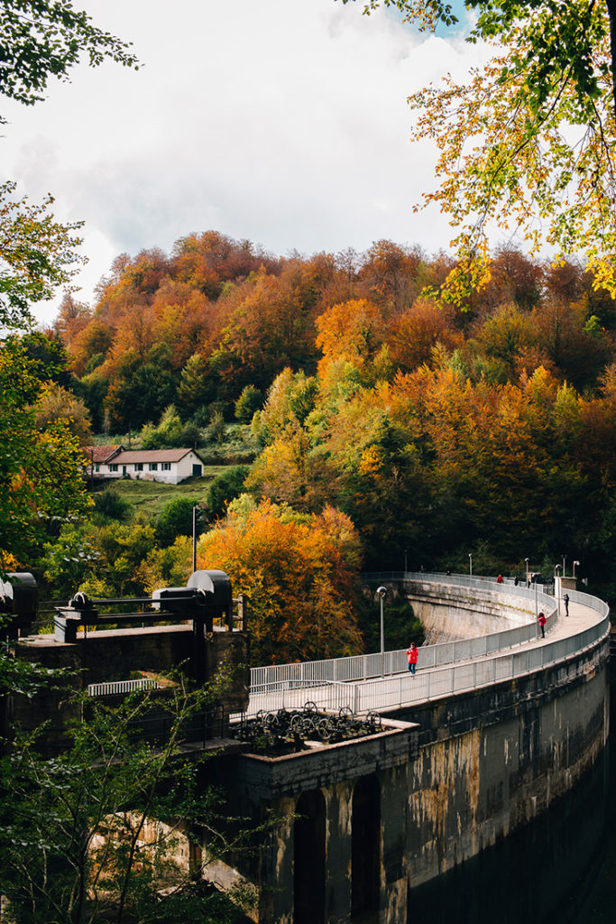 Comme la majorité des lacs du Pays Basque, ils sont avant tout des retenues de barrages, des réservoirs, et l’Embalse de Irabia n’y fait pas exception. Un grand barrage en arc-de-cercle vient marquer le début ou la fin de la balade, mais un départ comme un autre avant une plongée en son cœur boisé.