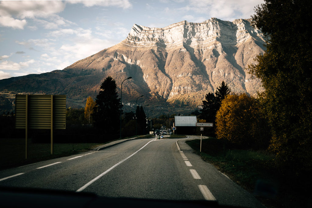 Le seul attrait de cette route est d’apercevoir le cul des Bauges et la sublime Dent d’Arclusaz qui, de sa forme de vague et ses 2 040 m, se fait pudiquement dorer le sommet. Aucun parking sur la route pour en apprécier la vue depuis et le premier parking se trouve être au beau milieu d’un champ, bien trop loin du paysage le plus impressionnant.