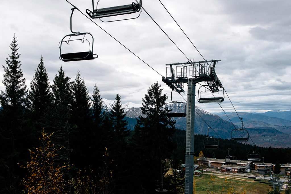 Nous profitons de l’étape pour un arrêt dit…technique. Comme il est étrange de traverser des rues où flottent des lignes de rampes de télésièges stoppés au-dessus de la route et bousculés par les assauts d’un petit vent automnal.