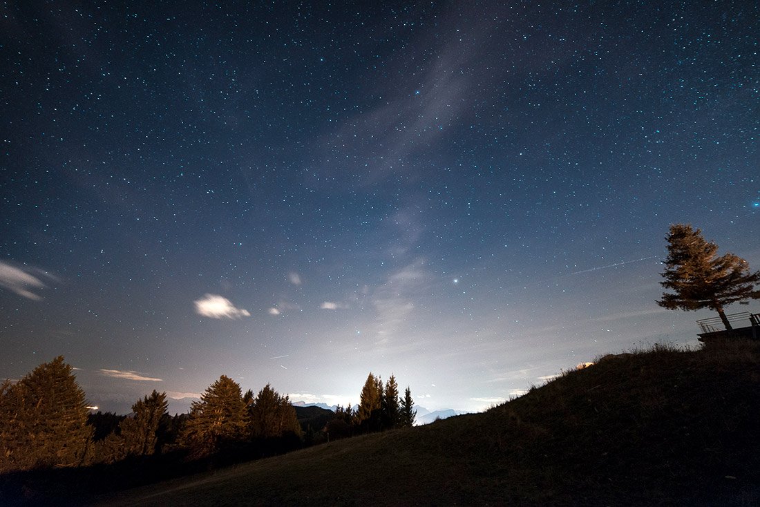 Et en effet, elles resteront bien dehors, tout feux allumés, tout au long de la soirée bien que parfois émaillées par quelques nuages rabat-joie. Nous profitons de cette nuit sans lune et malgré l’éclairage pour apprécier le ciel étoilé. De Cassiopée à Orion, de la voie lactée à l’étoile polaire, toutes sont là.