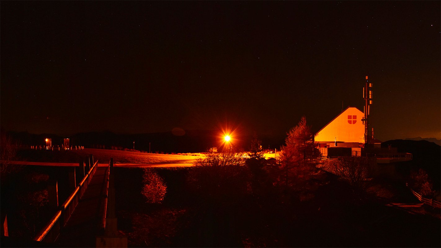 Du coup, nous reprenons la route, faisons machine arrière et revenons sur nos pas, après tout, bien que la fatigue me fait perdre mes moyens, nous ne sommes plus à quelques kilomètres près. En haut, là-haut, j’avais cru apercevoir quelques spots, sauf que wallou, nada, queud’. Nous poussons jusqu’au Revard pour terminer au pied de ce qui semble être – de nuit – l’ancien train à crémaillère qui descend sur Aix.