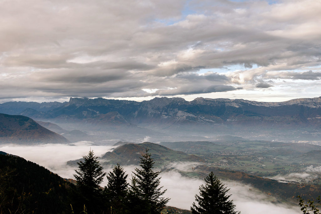 De l’autre côté, la vue s’échappe jusqu’à Grenoble que l’on distingue à peine sous une couche laiteuse de nuages dont on ne préfère pas en connaitre la composition. Quelques montagnes s’amusent à jouer avec la lumière du soleil et qui de temps en temps transperce les nuages de quelques raies mystiques. La vue à 280° est magnifique, idyllique surtout dans ce réconfortant silence. A cet instant, nous possédons la station, le lieu et ses montagnes. Nous remplissons nos poumons à fond ainsi que nos yeux de belles images.