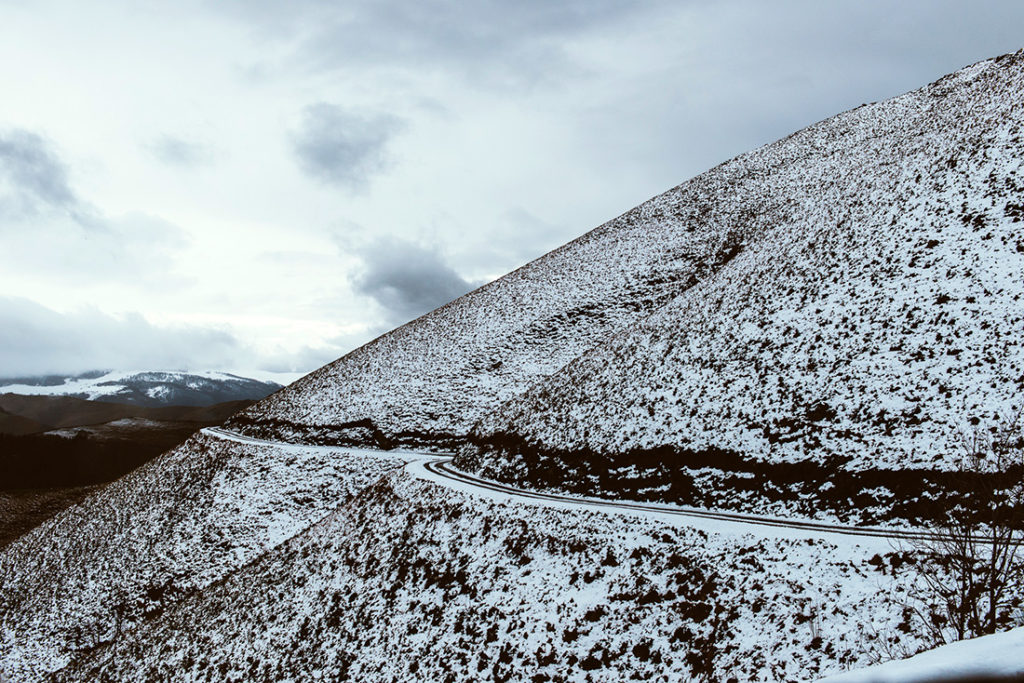 On avait déjà eu par le passé la chance de voir Harpea sous la neige, de dessiner les zig-zags de la forêt d’Orion pour finalement se prendre en pleine gueule la beauté d’un blanc immaculé. Sauf que là, au fur et à mesure des virages, la neige commençait à apparaitre par plaques beaucoup plus tôt que prévu. Et puis les plaques se sont transformées en lambeaux, les lambeaux en paquets et les paquets en un drap blanc et puis finalement c’est une énorme couette à plumes qui recouvrait la route.