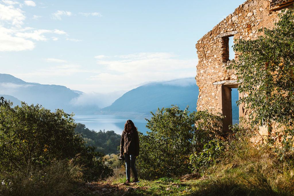 Nous noterons toutefois que malgré les panneaux « chasse interdite », le sol est jonché de douilles. Le petit plus de ce bivouac, c’est un chemin qui longe le promontoire rocheux donnant une vue à couper le souffle sur toute la vallée et les village de Benavent et Biscarri. La vallée et les champs se gorgent alors d’une lumière dorée avec, suspendues au-dessus, des langues de brumes venant adoucir l’horizon.